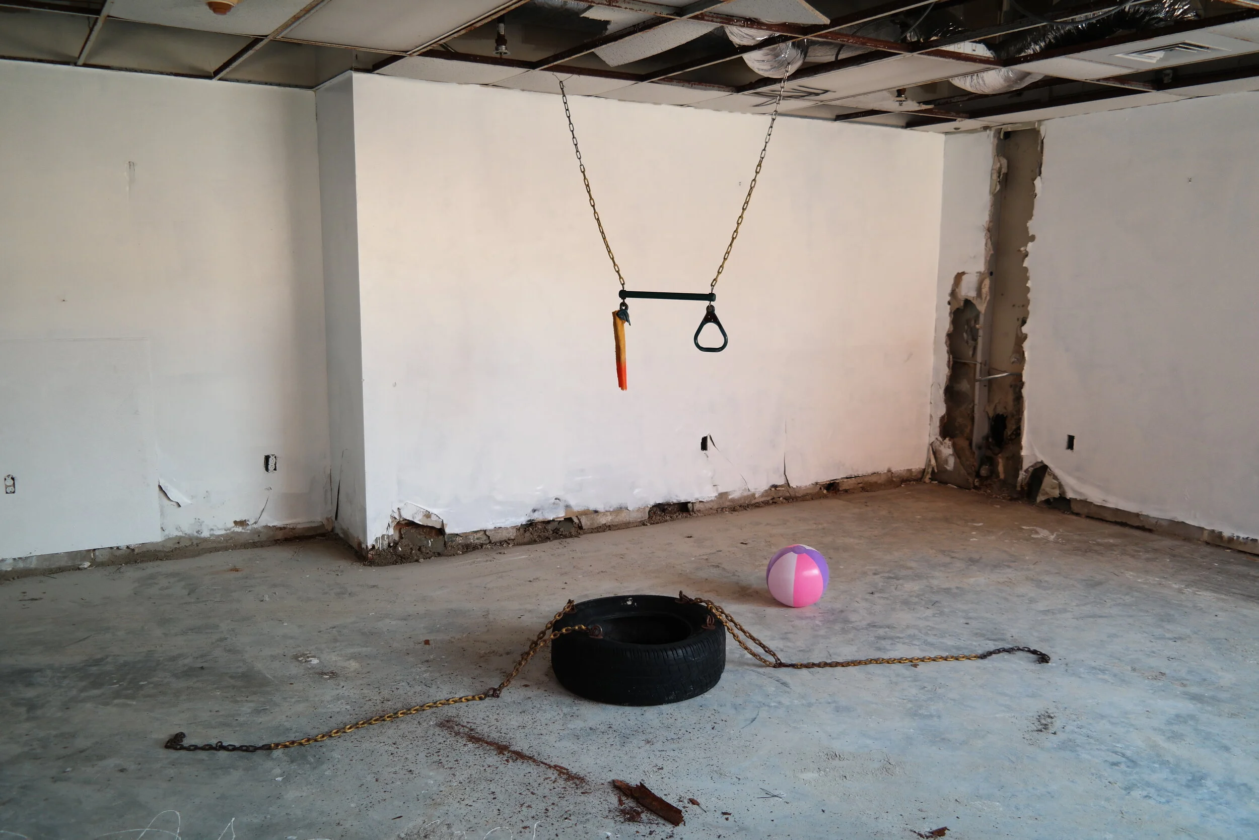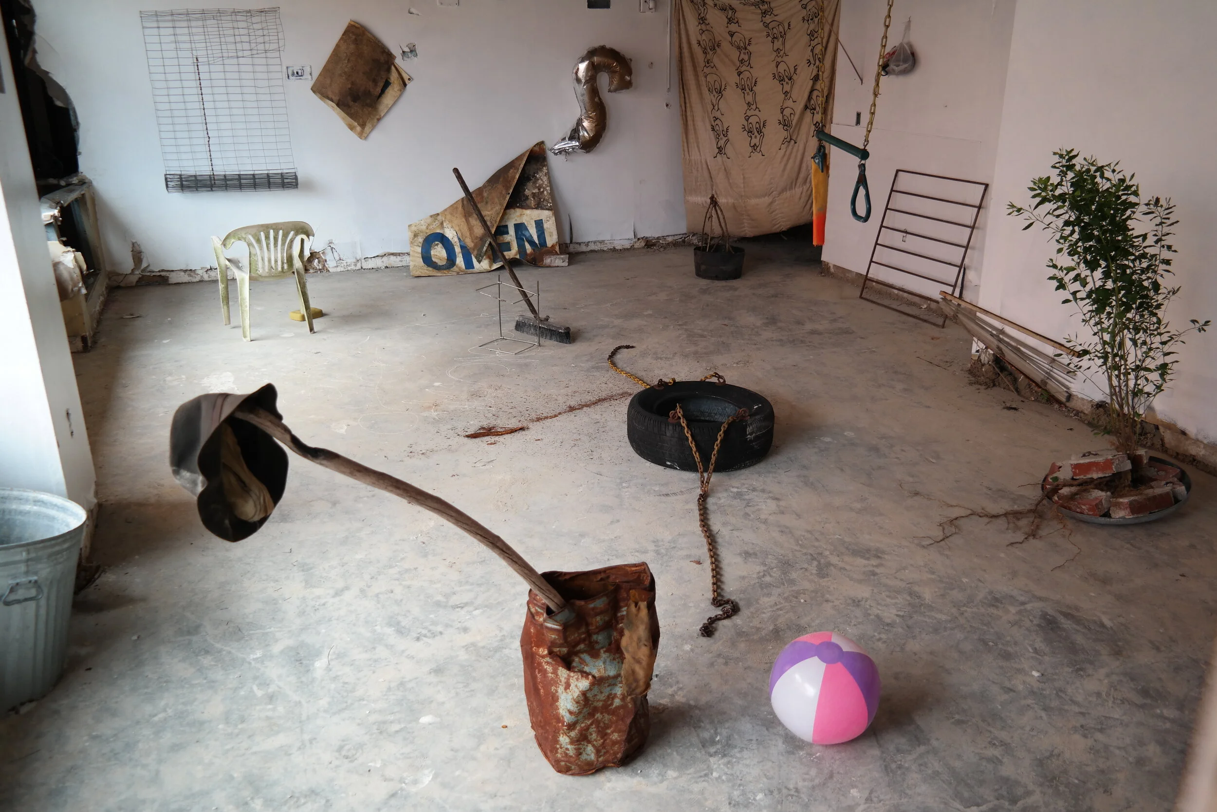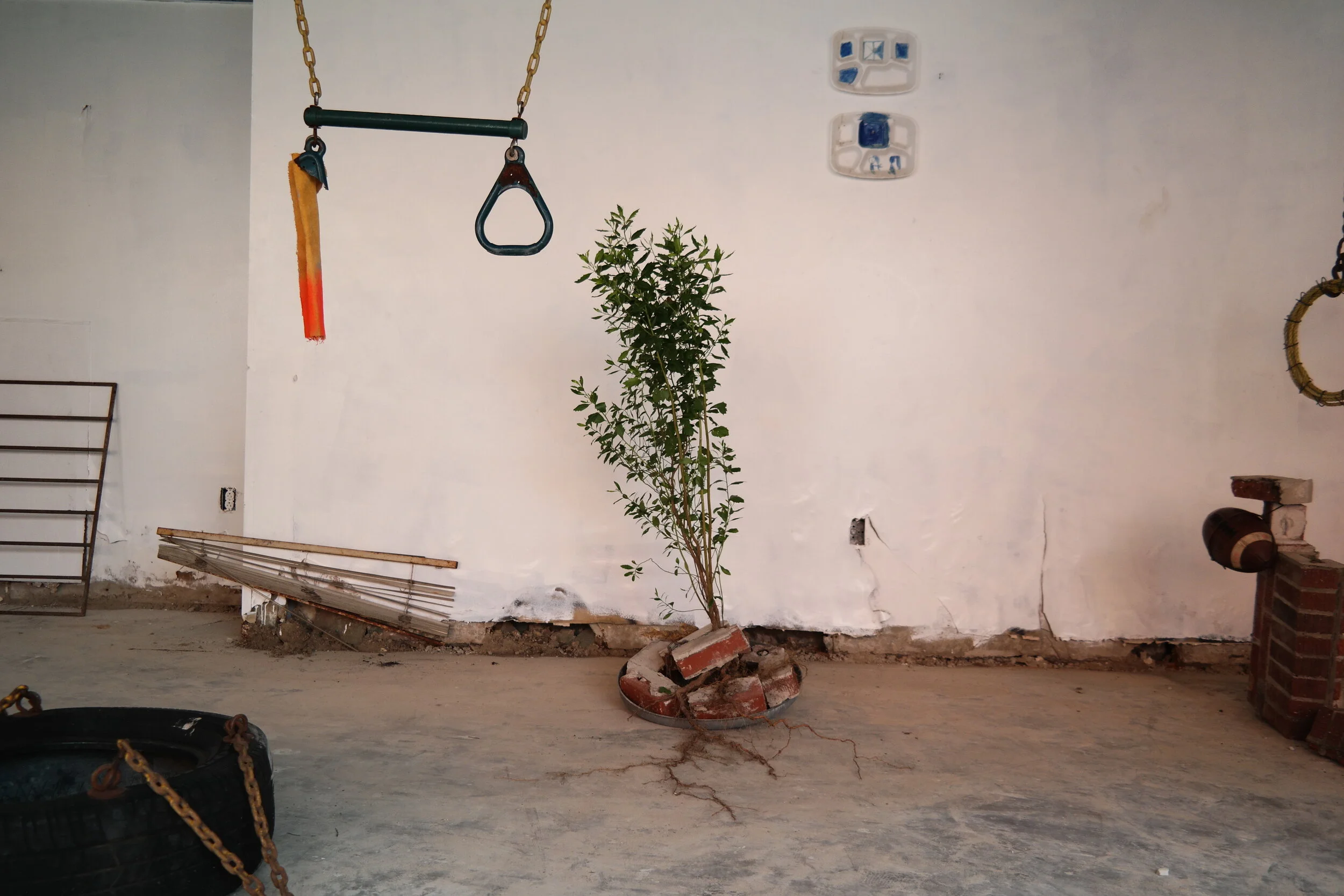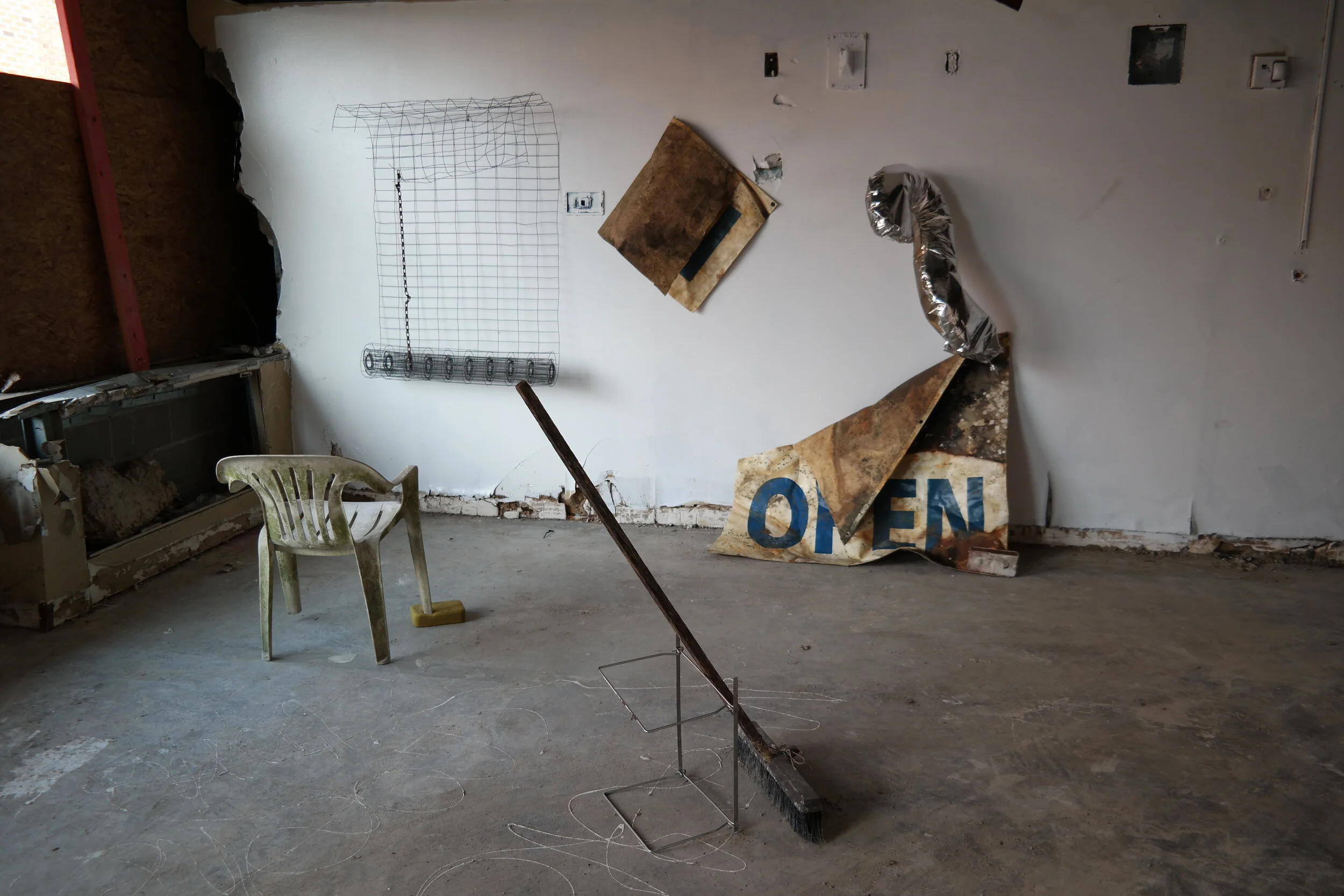 The derelict building was selected as a sculptural object. The area within was cleared of debris and painted white— a form of carving, defining shape through a reductive process. The building was transfigured and the initial sculpture was complete. The floor was swept and materials were brought into the space, not found on sight, but from outside, collected previously from various times and places. The materials were arranged and the nez garden was created.