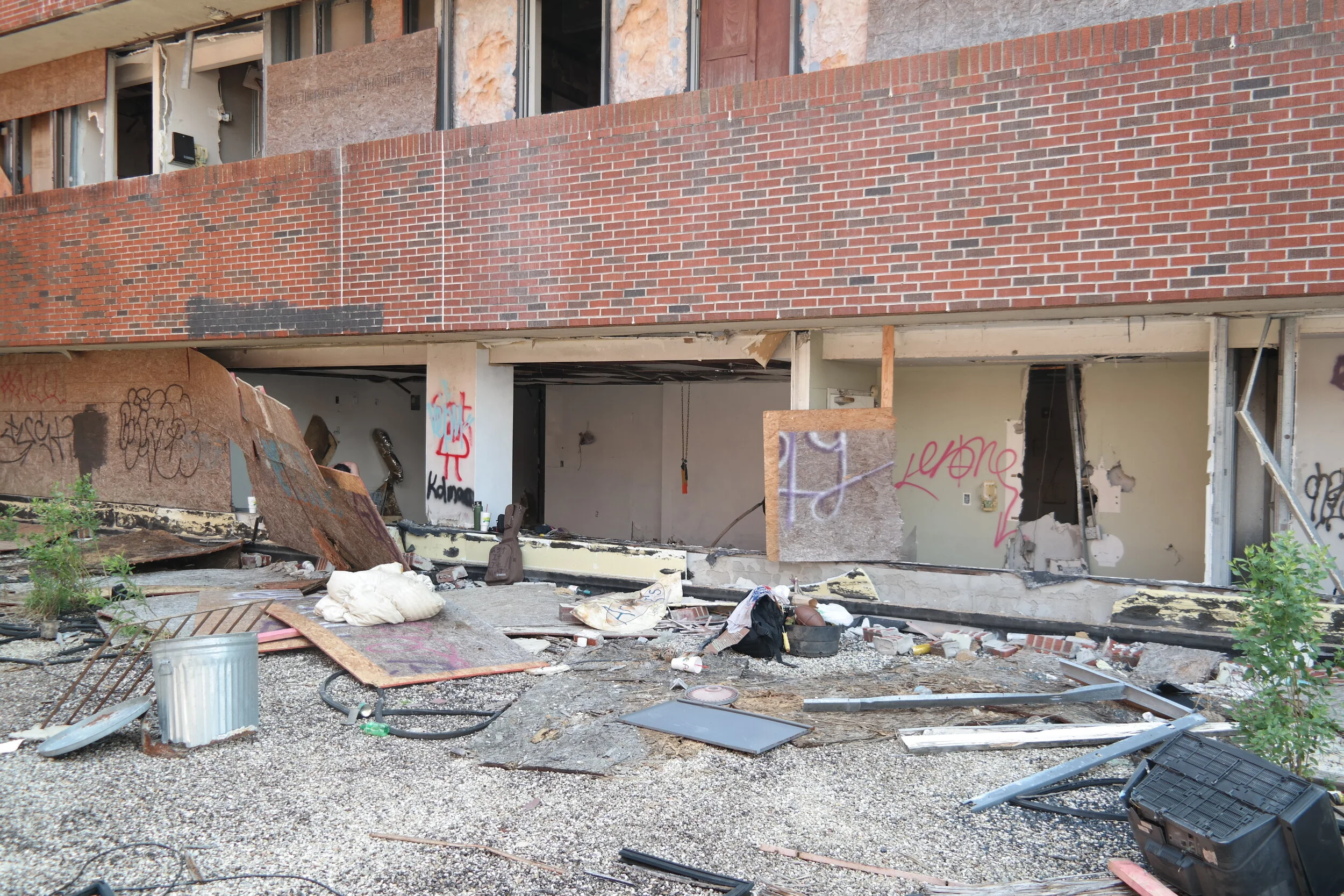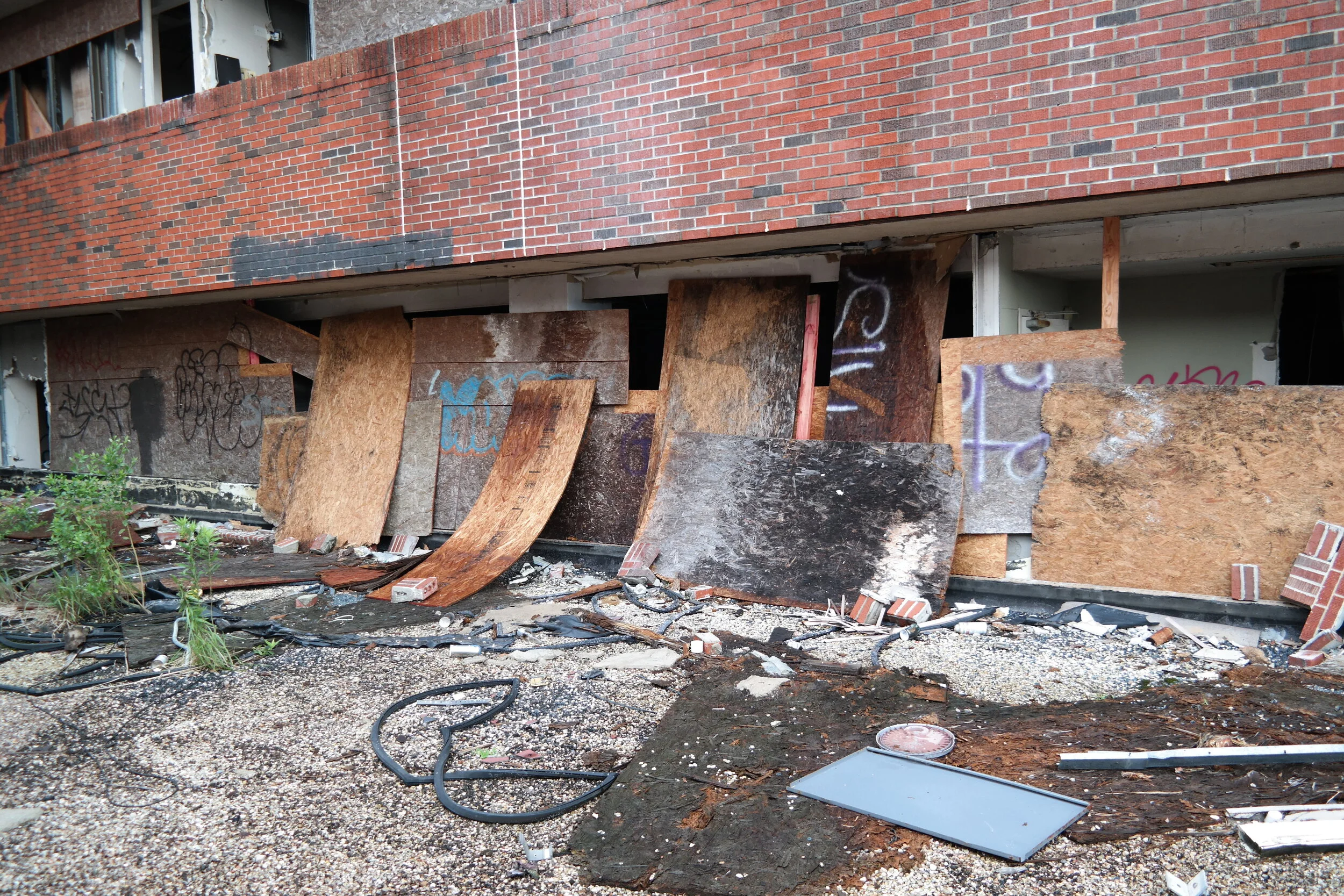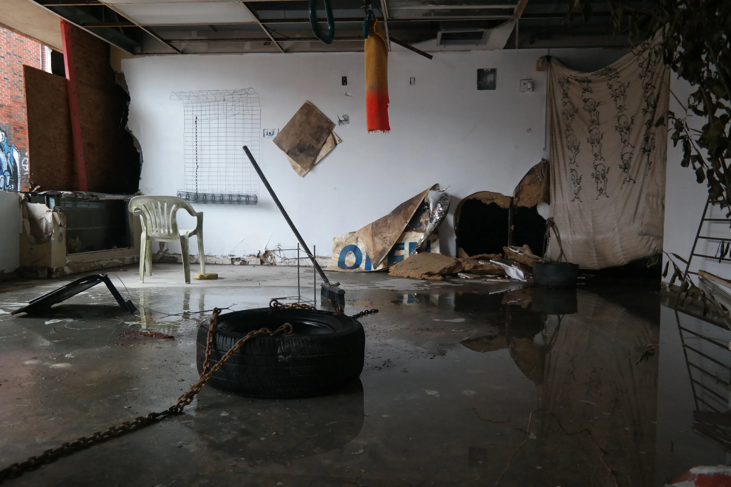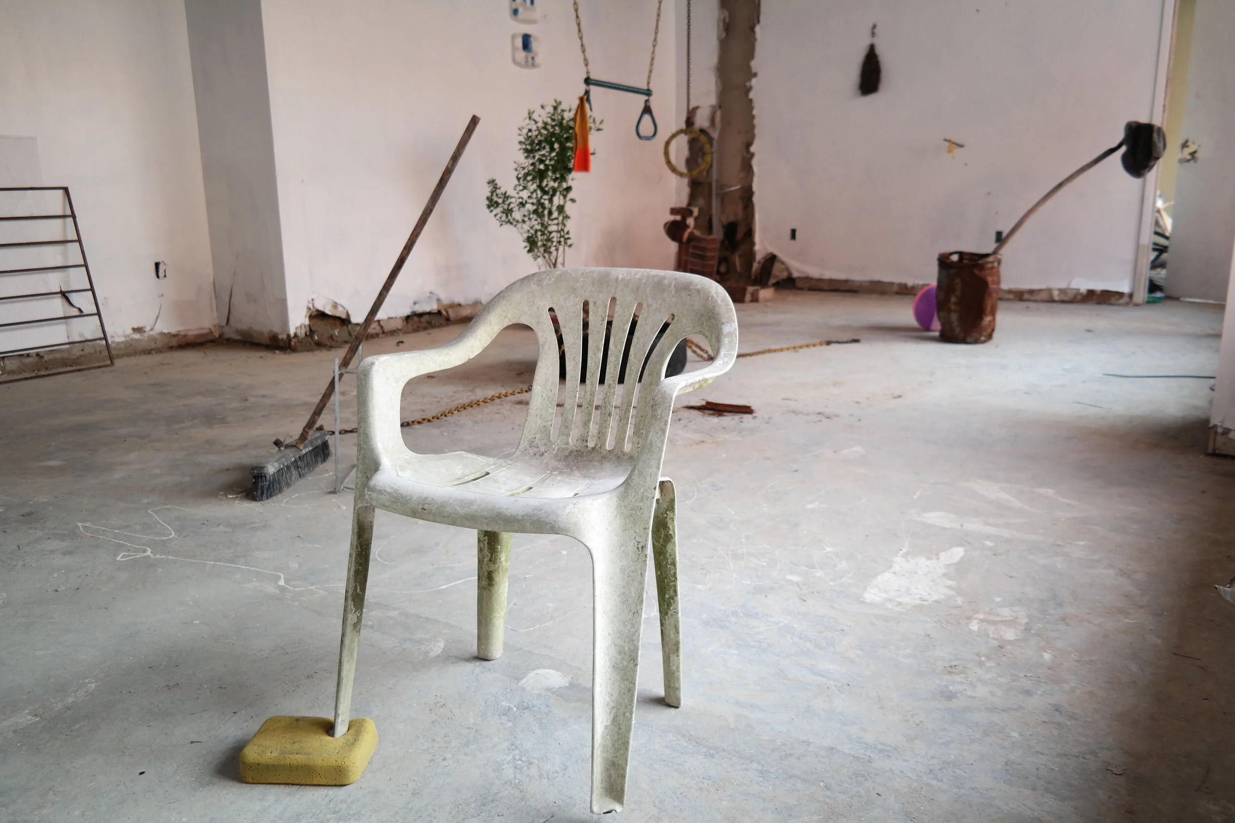 The derelict building was selected as a sculptural object. The area within was cleared of debris and painted white— a form of carving, defining shape through a reductive process. The building was transfigured and the initial sculpture was complete. The floor was swept and materials were brought into the space, not found on sight, but from outside, collected previously from various times and places. The materials were arranged and the nez garden was created.